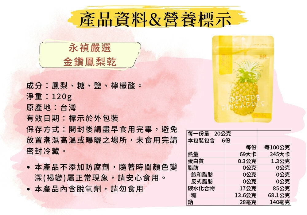 *永禎果乾由天然水果製成,自然因素如季節、天氣、溫度、雨量等會影響每批水果的收成會造成差異,因此製成果乾的口感色澤外觀也會略有不同,如有疑慮請先咨詢客服。