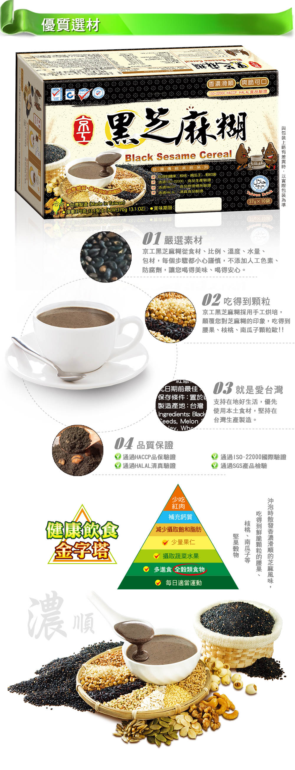沖泡時散發香濃滑順的芝麻風味,吃得到鮮脆顆粒的腰果、核桃、南瓜子…等堅果穀物,SGS檢驗無膽固醇,通過ISO 22000、HACCP、HALAL國際食品驗證的台灣傳統茶飲。